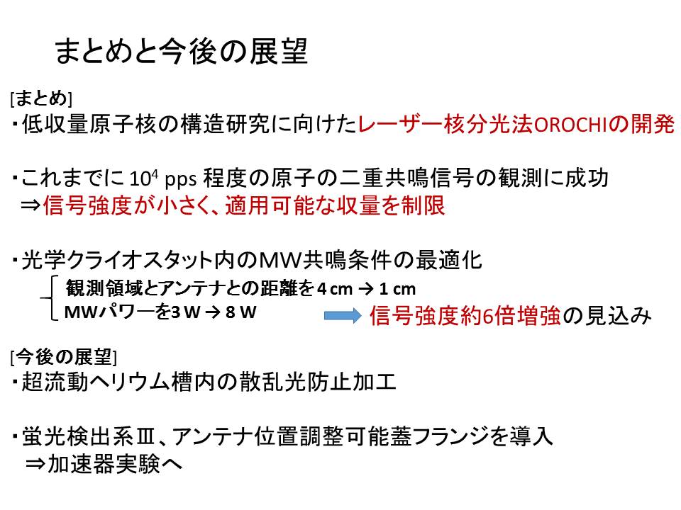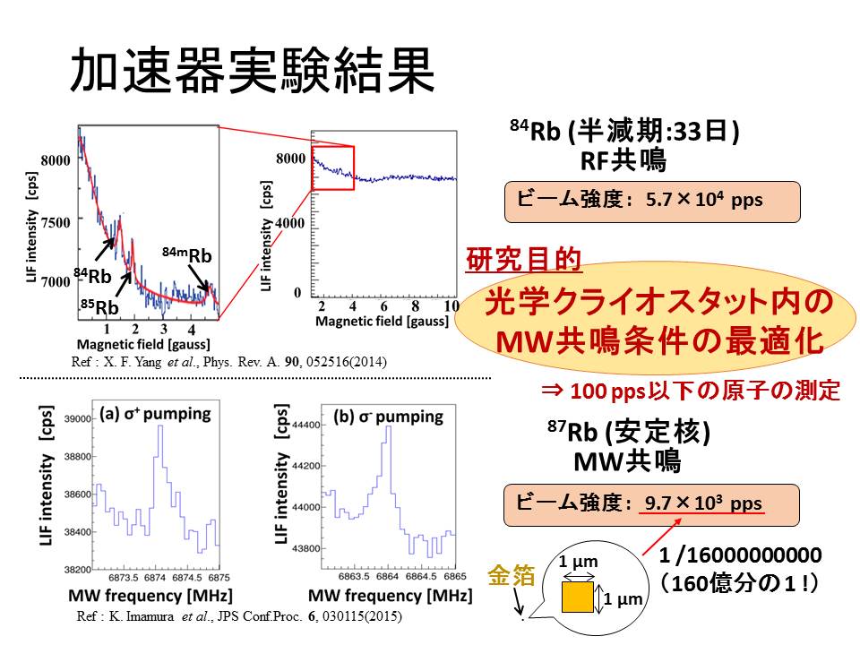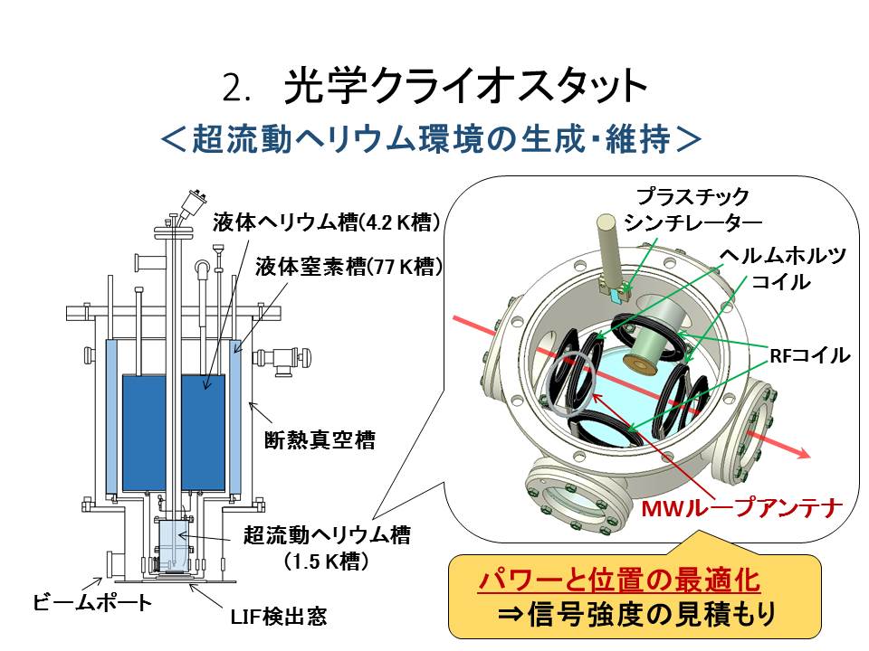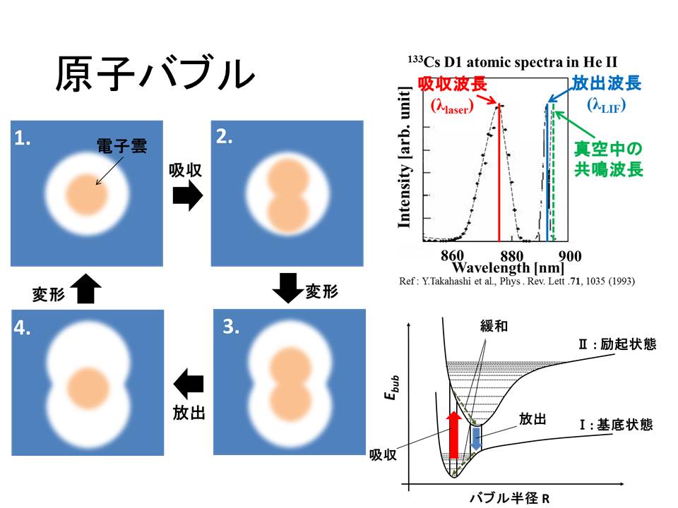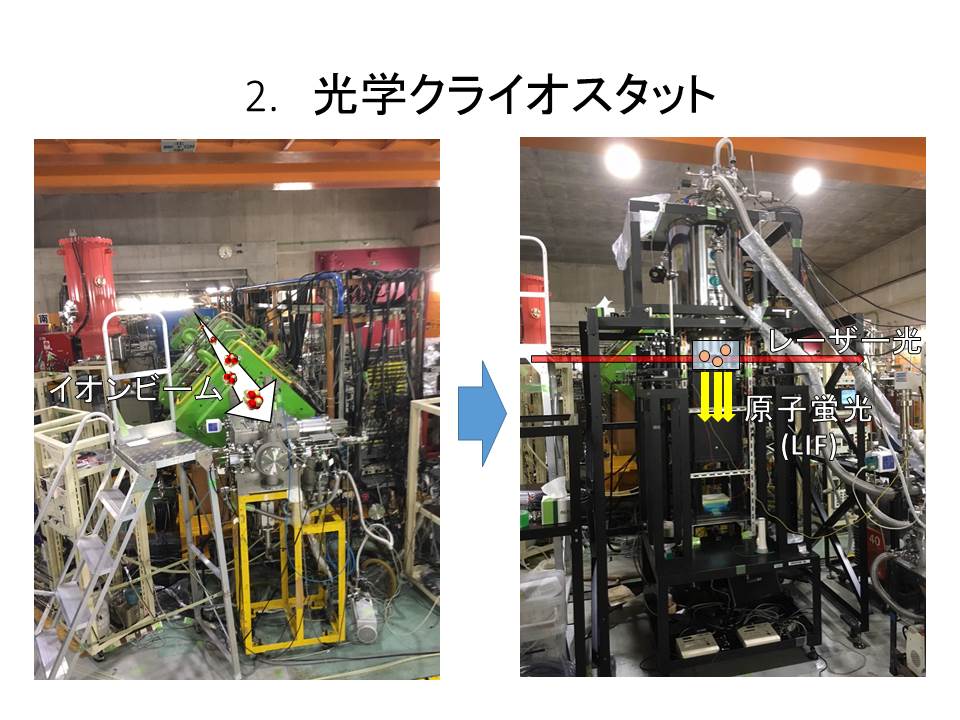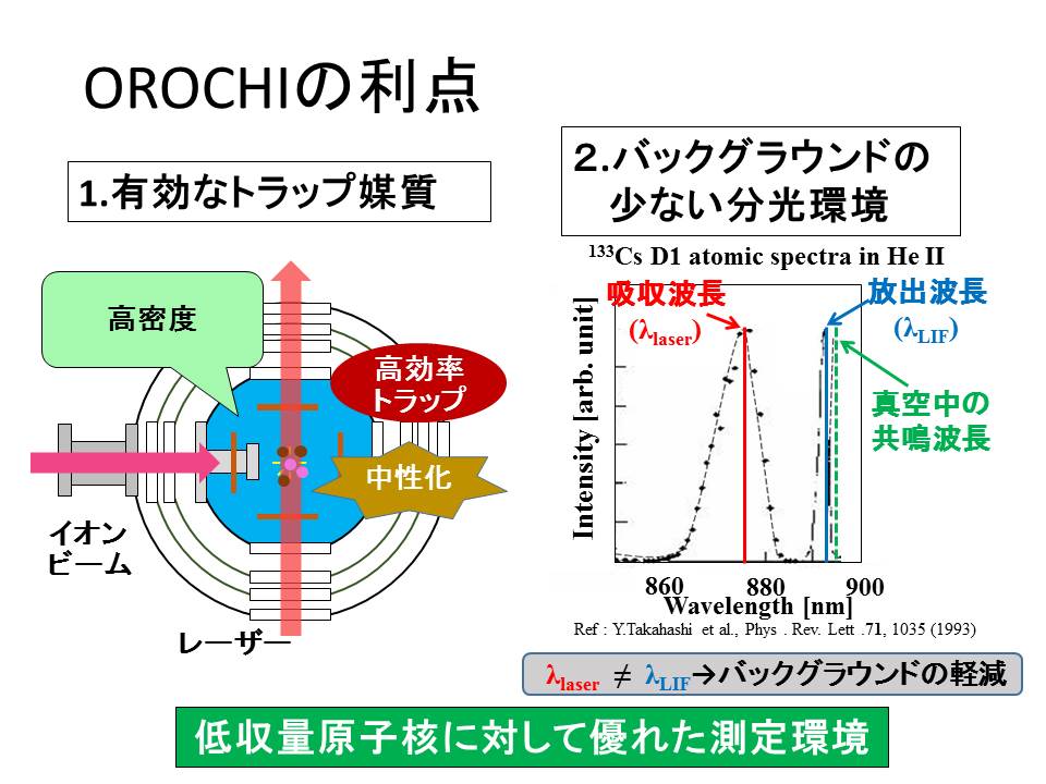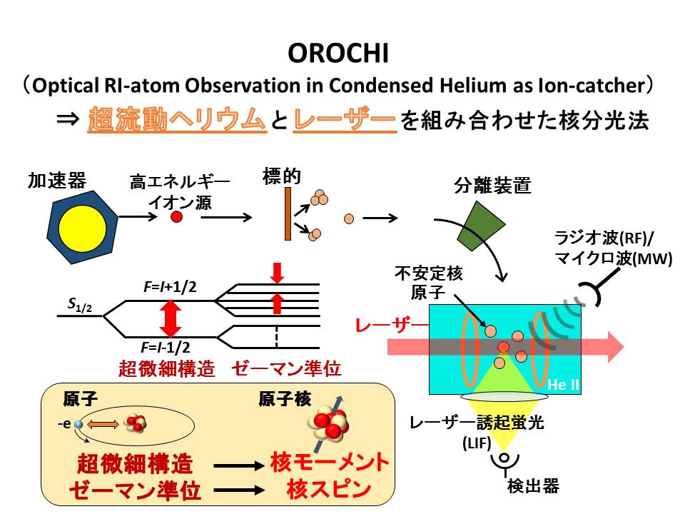 超流動ヘリウムは高密度媒質であり、加速器で生成された高速のイオンビームを1 mm3程度の領域に停止させることができます。 理化学研究所との共同研究において、人工的に生成された微量な原子であっても、超流動ヘリウムに閉じ込め逃がさないようにしてからレーザーで観測する手法を開発しています。